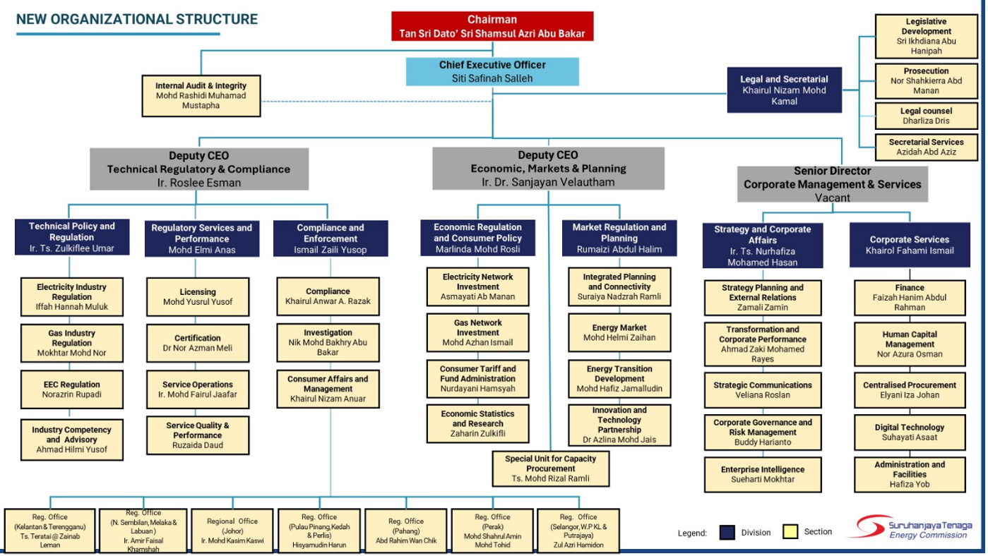 Lastly, the Legal and Secretarial Division reports directly to the Chief Executive Officer of Energy Commission. This division provides legal advisory and guidance to strengthen institutional governance and integrity and safeguard ST’s position as an independent regulator. Kharul Nizam Mohd Kamal is the Head of Division.
