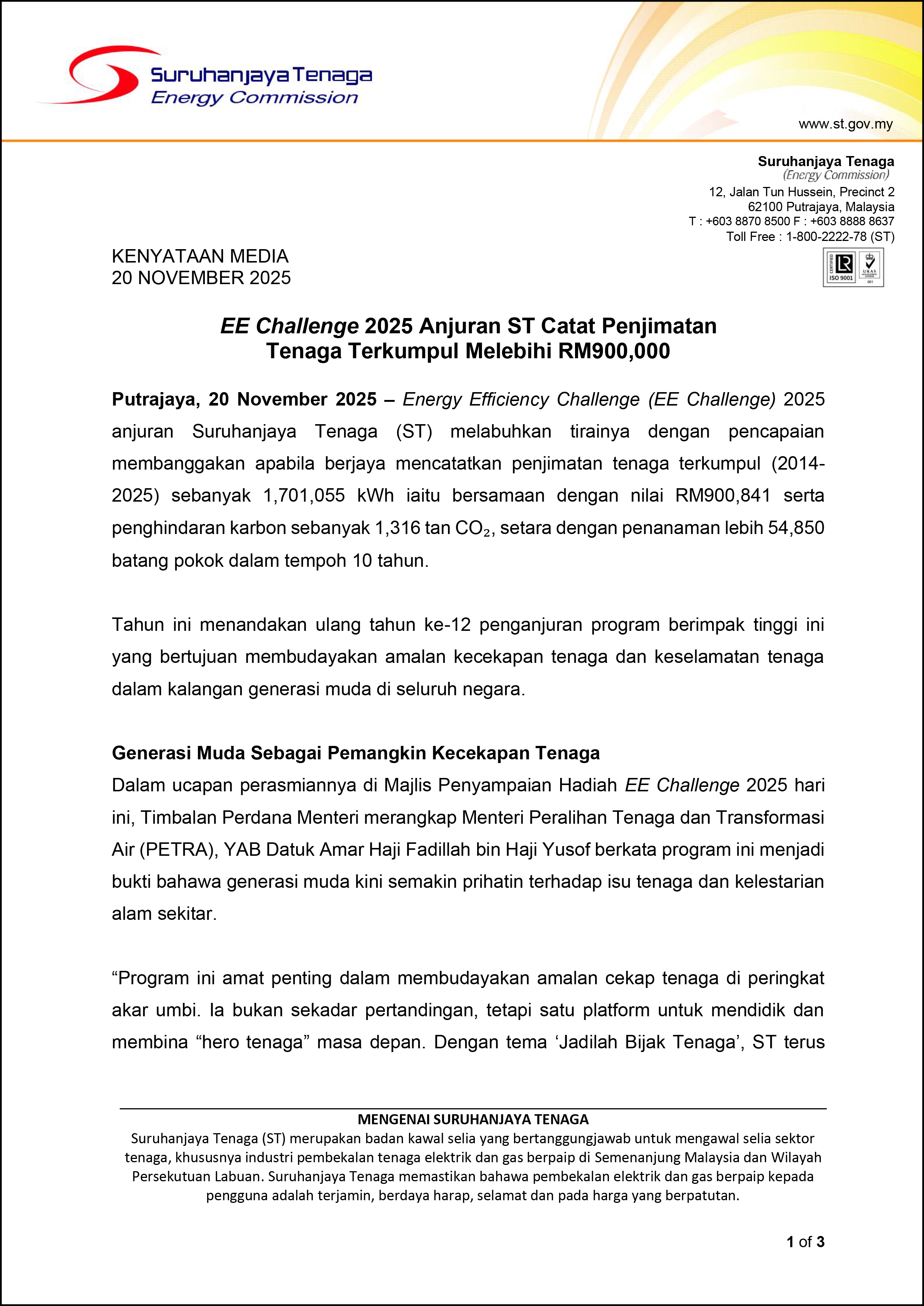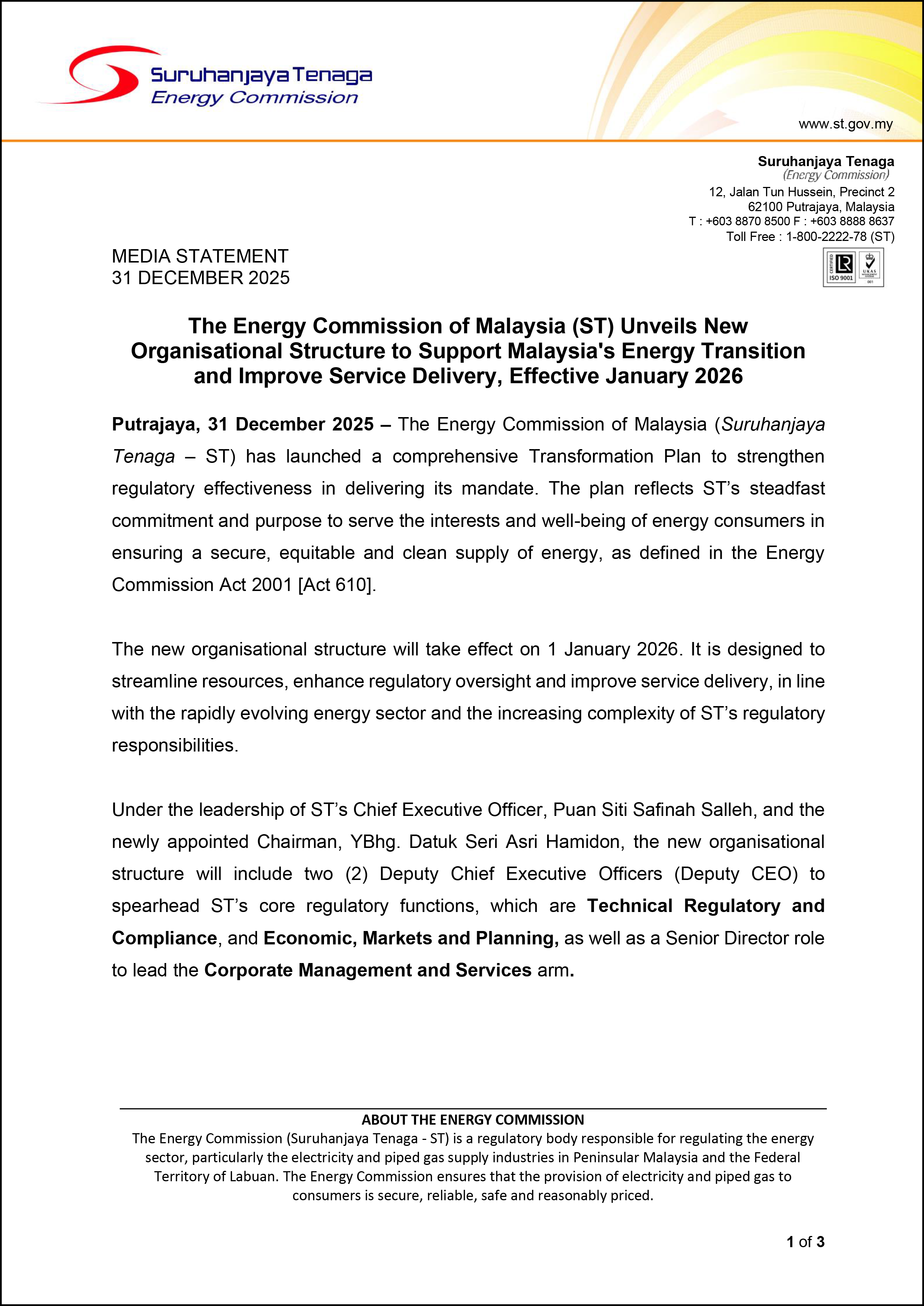 Energy Commission,No. 12, Jalan Tun Hussein, Precinct 2, 62100 Putrajaya, Malaysia.