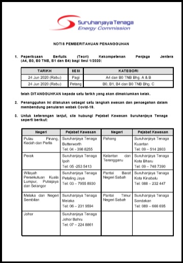 | 21 | Notis Pemberitahuan Peperiksaan Bertulis (Teori) Kekompetenan Penjaga Jentera Elektrik (A4, B0, B0 TNB, B1 & B4) | 03/02/2025 |