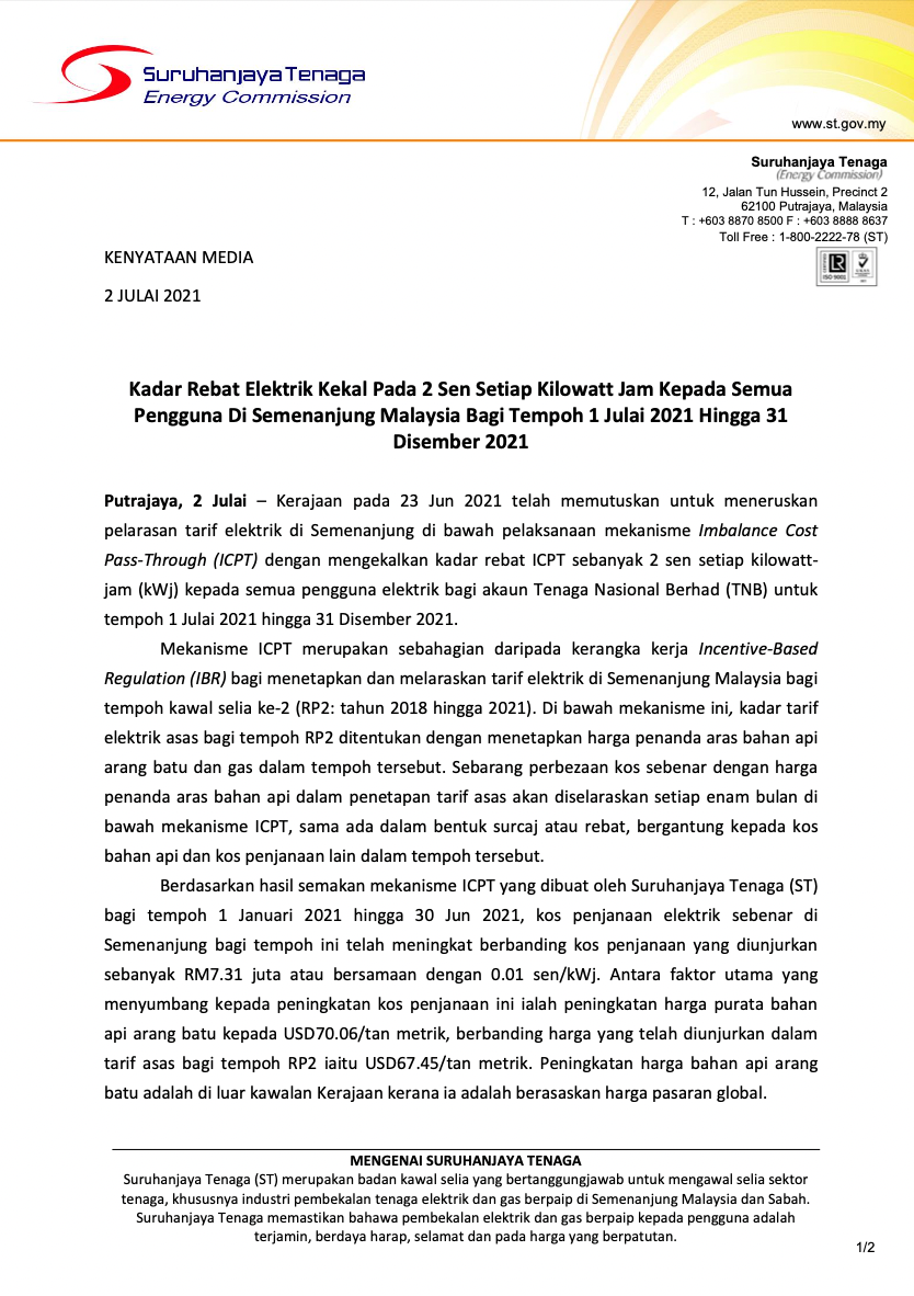 | 88 | Pelarasan Tarif Elektrik di Sabah dan WP Labuan bagi Tempoh 1 Julai - 31 Disember 2023 | 28/06/2023 |