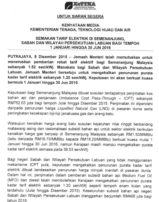 | 65 | 99% Pengguna Domestik Di Sabah Dan Wilayah Persekutuan Labuan Tidak Terjejas Dengan Pelarasan Tarif Elektrik Bagi Tempoh 1 Januari Hingga 30 Jun 2024 | 26/12/2023 |